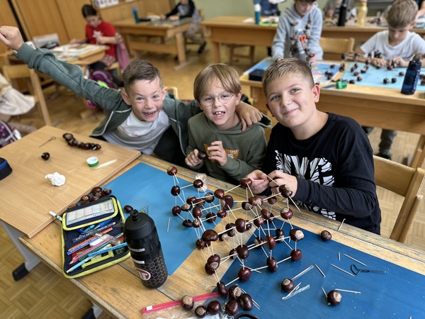 Wir arbeiten mit der Laubsäge und erstellen kreative Konstruktionen mit Kastanien und Zahnstochern.