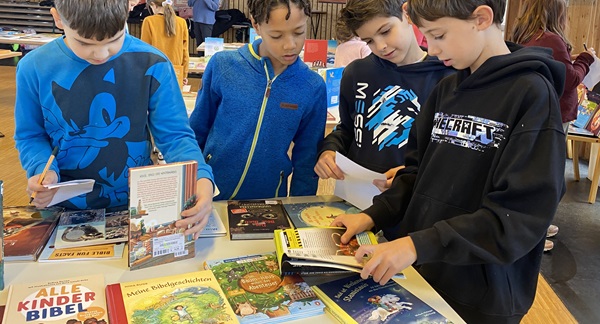 Unsere Kids sind fasziniert von den vielen Büchern und notieren Titel, die vielleicht das Christkind bringen könnte.